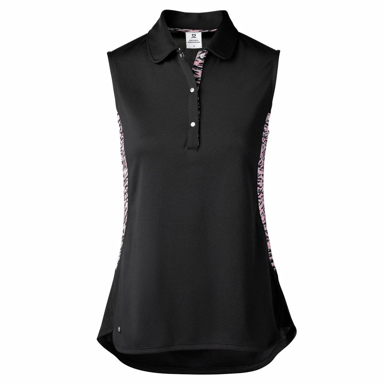 Get a sporty look for the golf course with the Daily Sports Beth Sleeveless Golf Polo. This polo is built with the finest fabric qualities that are high tech breathable materials that provide active ventilation and rapid moisture absorption to keep you dry and comfortable during your round. The fabric also dries quickly and does not fade from the sun so it looks brand new for years. There is an animal print trim that adds a subtle touch of style that will look great out on the course.